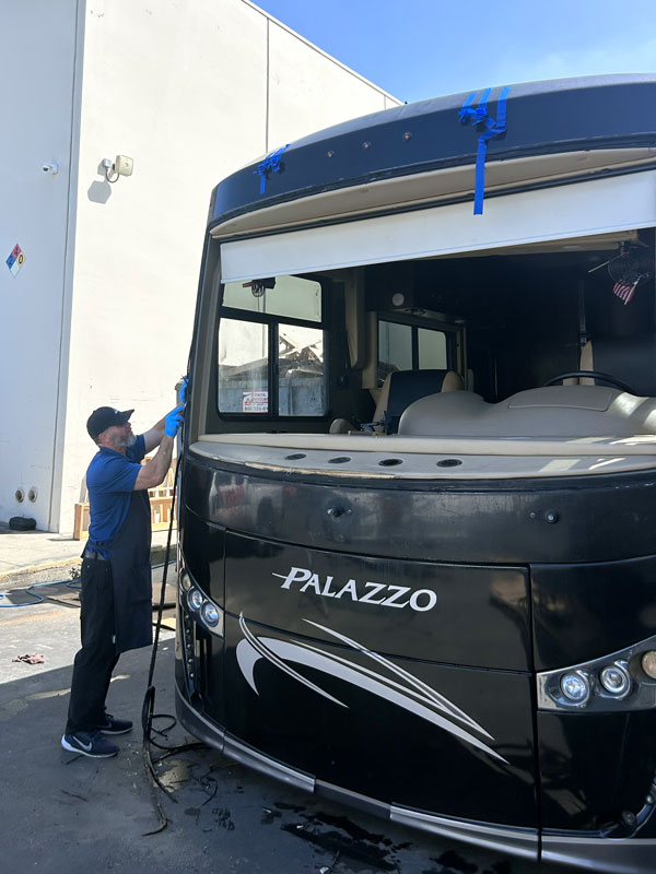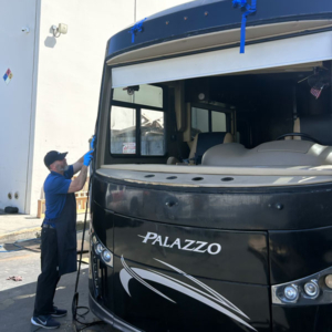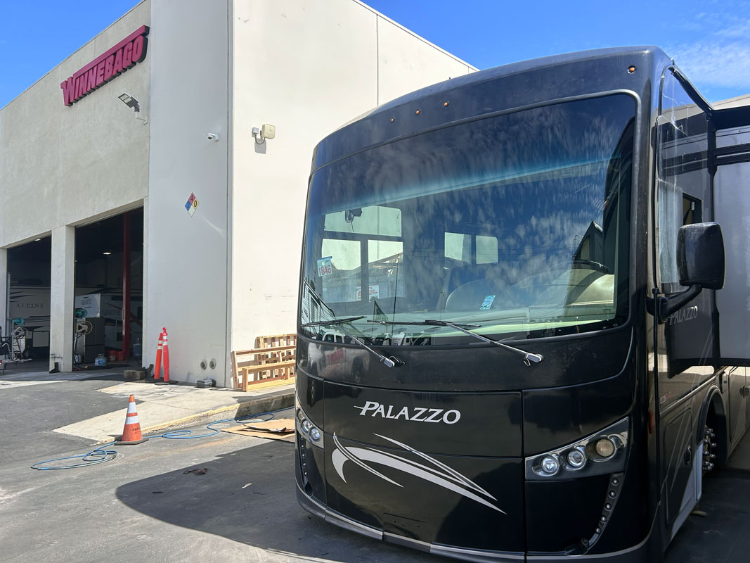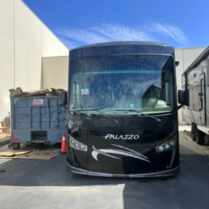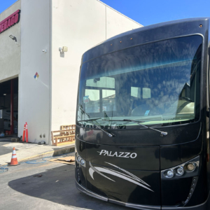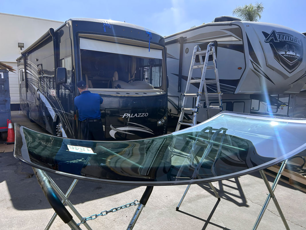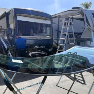 This job was a windshield replacement on a 2021 Thor Palazzo RV. For this job, we travelled to Mike Thompson RV in Fountain Valley, CA. We have been doing RV windshield replacement and RV glass repair for them for decades.